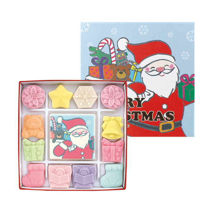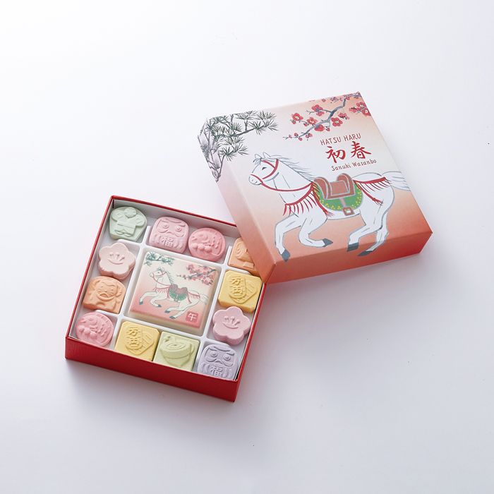 干支の午が描かれた中央の大きな和三盆をはじめ、だるま、小槌、梅の花等、新しい年の始まりを華やかに彩る季節限定商品です。