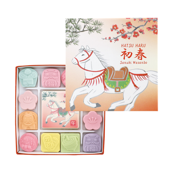 2026年の干支「午」や縁起の良い形の和三盆を組み合わせた新商品です。