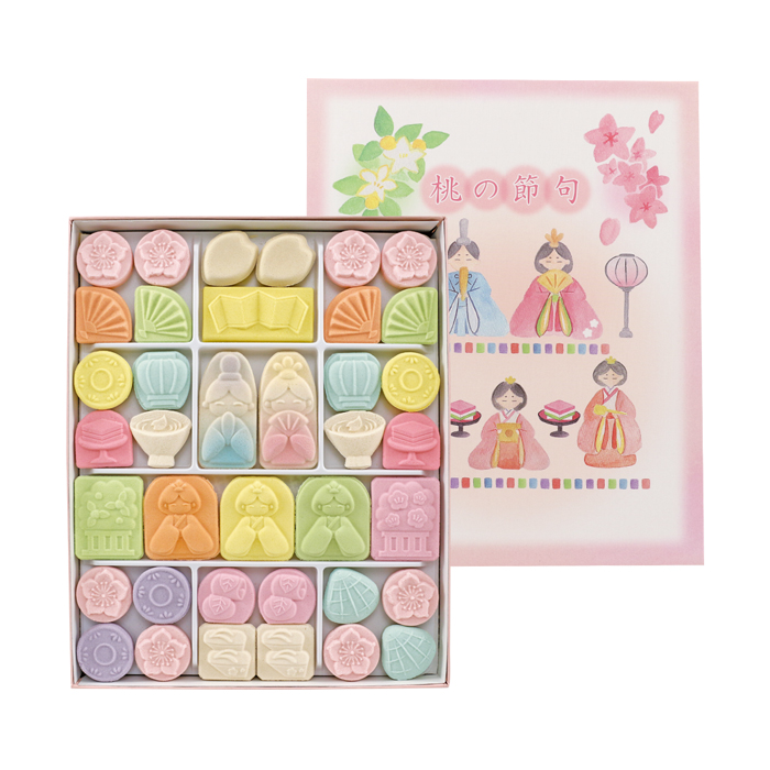雛段飾りをイメージした華やかな詰合せ「桃の節句一段」、和三盆糖と純ココアをブレンドした上品で優しい甘さの「ちょこれいとわさんぼん一段」、各1箱ずつ計2箱をセットにしました。