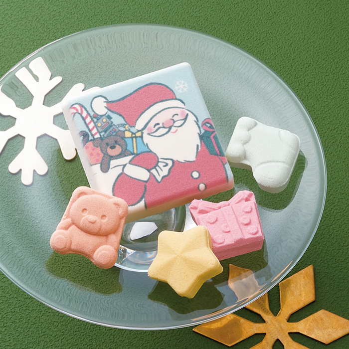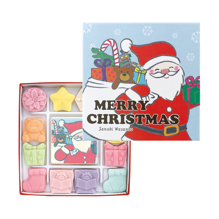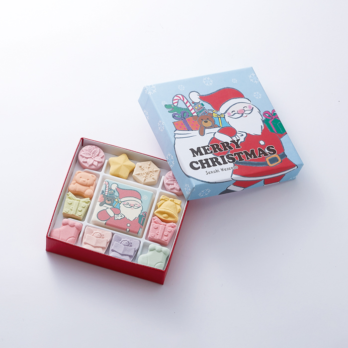 サンタさんが描かれた中央の大きな和三盆をはじめ、たくさんのクリスマスモチーフの和三盆たちが賑やかに迎えてくれるひと箱です。和三盆の優しい味わいをクリスマスの贈り物にいかがでしょうか。