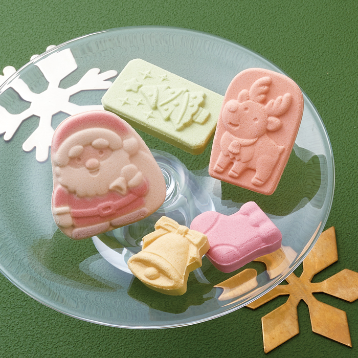 和三盆のサンタさんやトナカイをはじめ賑やかで楽しい「ハッピークリスマス一段」、半円のおめでたい紅白の和三盆を和紙で包んだ「くす玉一段」、各1箱ずつ計2箱をセットに致しました。