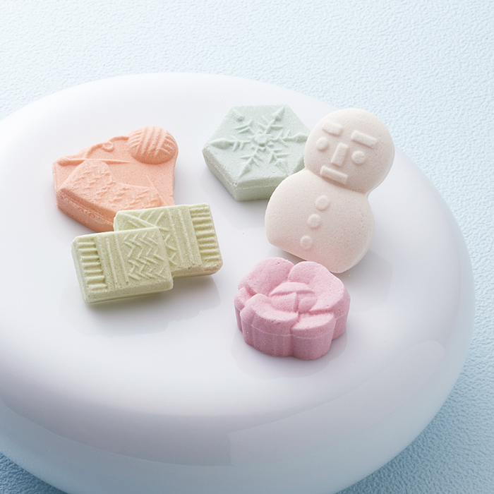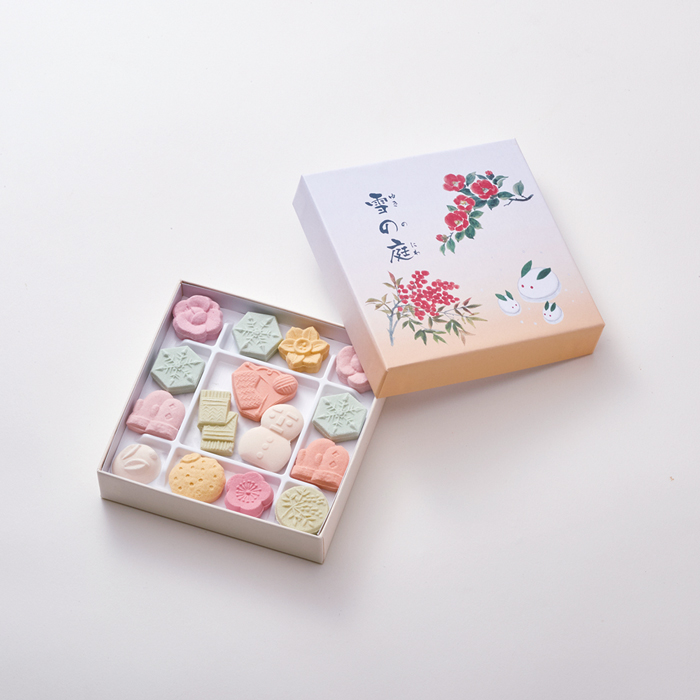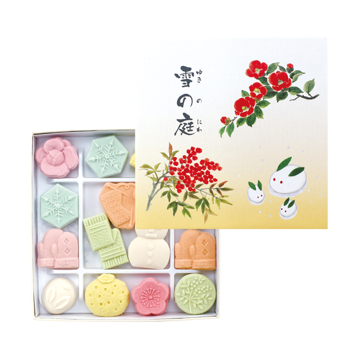 雪だるまや季節の植物を中心に、日本の美しい冬の風景を表現した「雪の庭」の小箱タイプです。雪のような和三盆の口どけをお楽しみください。