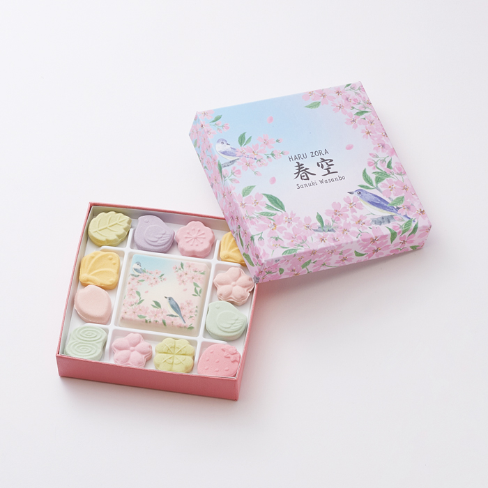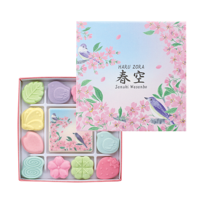 春の季節の新商品です。桜が描かれた中央の大きな和三盆をはじめ、蝶々、クローバー、イチゴなど、春を感じるモチーフを組み合わせました。美しい春色の和三盆をお楽しみください。