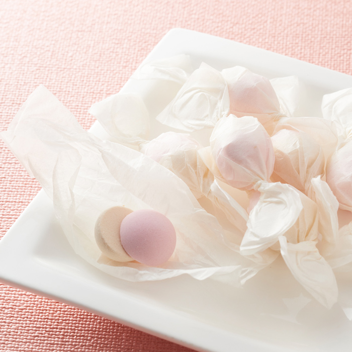 使いやすく、保存も便利なスタンドパックの「くす玉」。半球の紅白の和三盆が和紙に包まれています。
