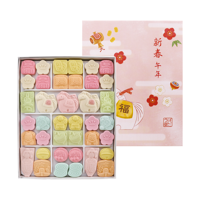 2026年の干支「午」と新春の和三盆を詰め合せた「新春一段」、半円のおめでたい紅白の和三盆を和紙で包んだ「くす玉一段」、各1箱ずつ計2箱をセットにしました。