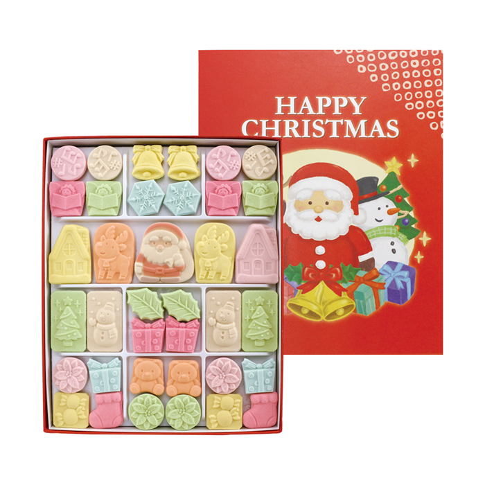 和三盆のサンタさんやトナカイをはじめ賑やかで楽しい「ハッピークリスマス一段」、和三盆糖と純ココアをブレンドした上品で優しい甘さの「ちょこれいとわさんぼん一段」、各1箱ずつ計2箱をセットに致しました。